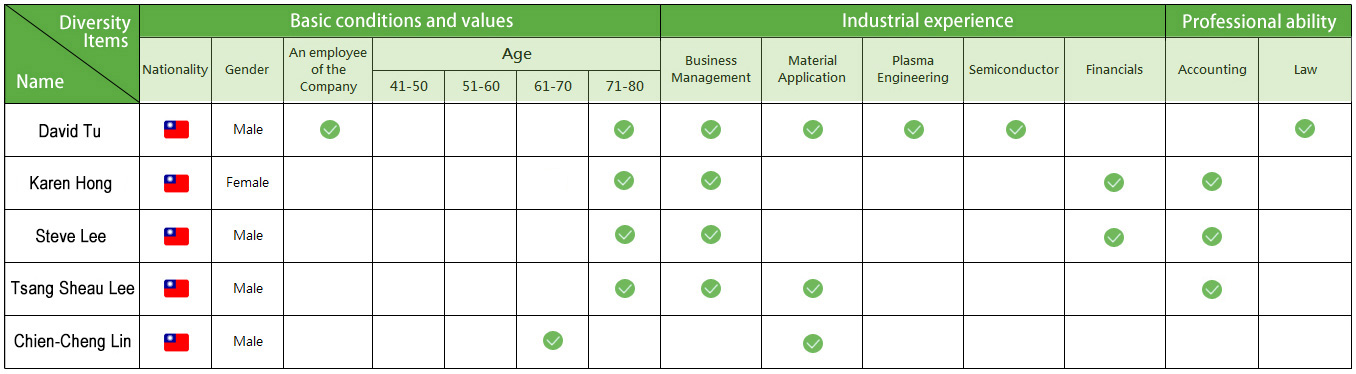 The selection of each director of the company is based on the comprehensive consideration of the director's professional qualifications, experience and diversity, and will not be affected by factors such as gender, age, nationality and culture. The company's board of directors is composed of a diverse group of directors to ensure the sustainability of the company. Make appropriate decisions for development. The company’s current board member diversity policy and implementation are as follows :